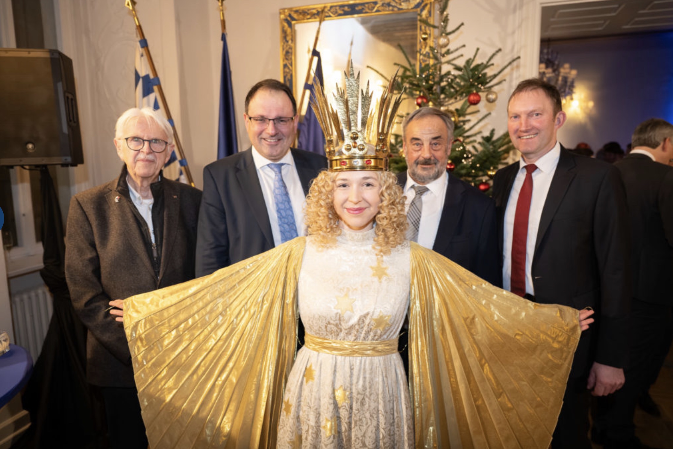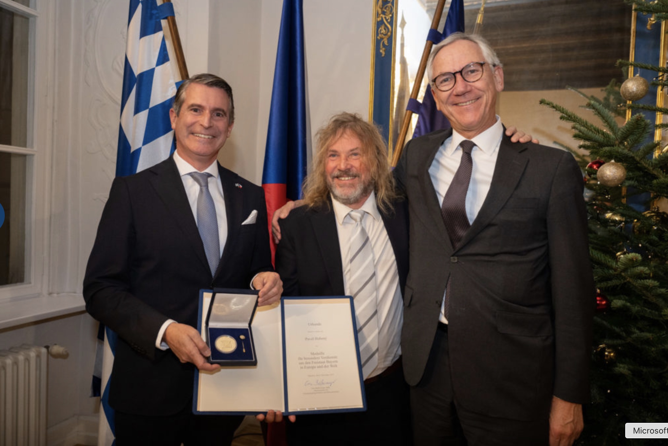 For the first time, this event took the form of an “Evening in Advent” and attracted not only a large number of guests, but also the original Nuremberg Christkind and an Augsburg Renaissance angel to the Chotek Palace in Prague’s Old Town. Singer Iris Maria Kotzian, accompanied by Eva Herrmann on piano, led the audience through an imaginary Christmas market with chansons and pre-Christmas readings, portraying a Renaissance angel. As another highlight of the evening, Pavel Hubený, Director of the Šumava National Park (Bohemian Forest), received the European Medal of the Bavarian State Chancellery from Bavaria’s Minister for European Affairs, Eric Beißwenger, at the Bavarian Representation in Prague. With this medal, the Bavarian State Government honors individuals who have made outstanding contributions to the Free State of Bavaria within a united Europe or to Bavaria’s international reputation in a variety of ways. State Secretary Martin Schöffel, as chairman of the Advisory Board for Cross-Border Cooperation with the Czech Republic, drew attention to the work of the people on the ground in the border region and thanked all Bavarians and Czechs who admirably championed good neighborly relations; in particular, he praised the cooperation between fire brigades and rescue services, as well as in prevention work and the fight against animal disease pandemics.