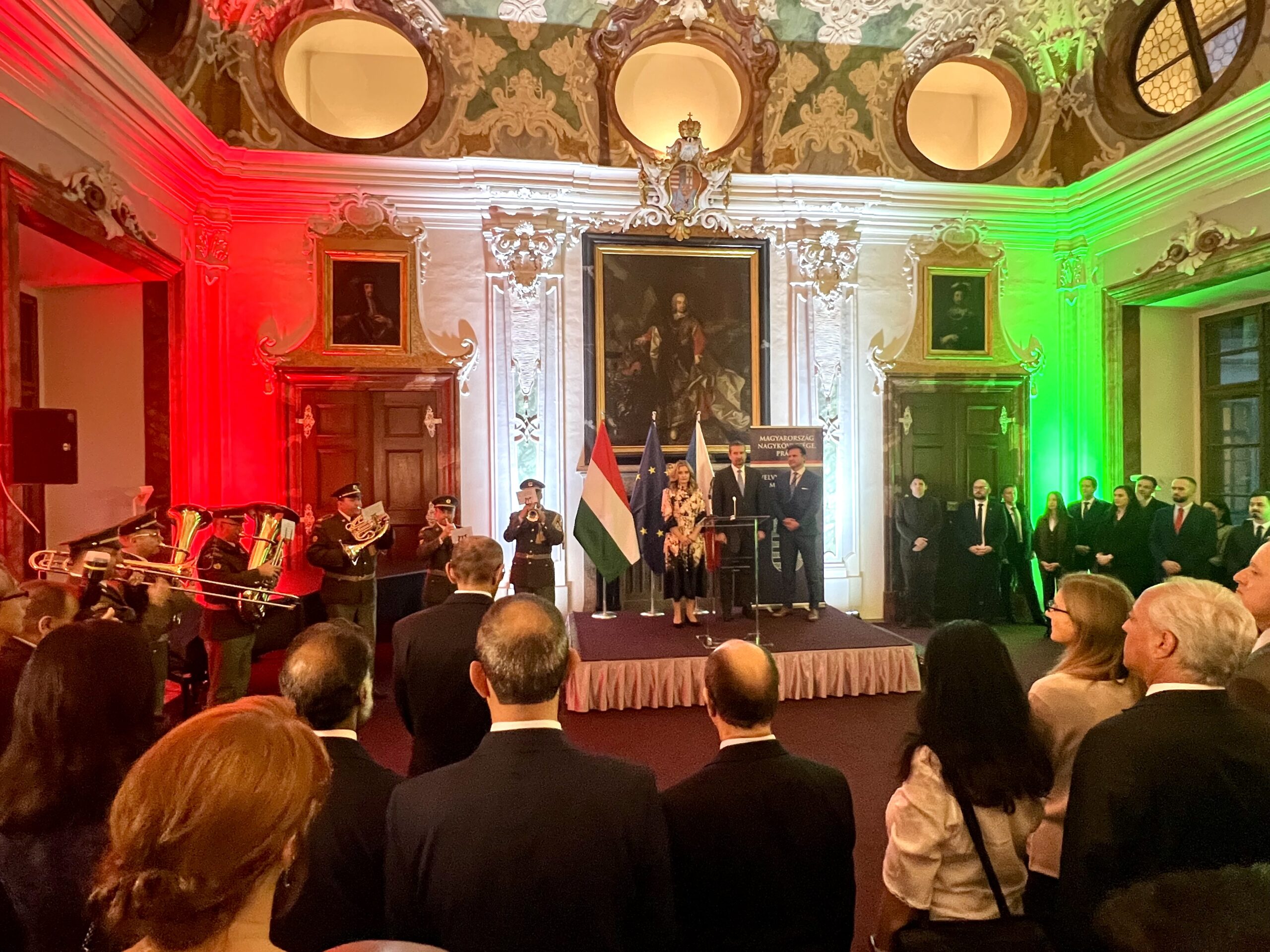 On Monday, October 20, His Excellency András Baranyi, Ambassador Extraordinary and Plenipotentiary of Hungary to the Czech Republic, hosted a festive reception on the occasion of the Hungarian National Day. The event took place in the magnificent premises of the Břevnovský klášter (Břevnov Monastery) in Prague 6. Numerous guests accepted the invitation, including friends of Hungary, members of the diplomatic corps, the Hungarian community in Prague, and representatives from business, politics, and culture.